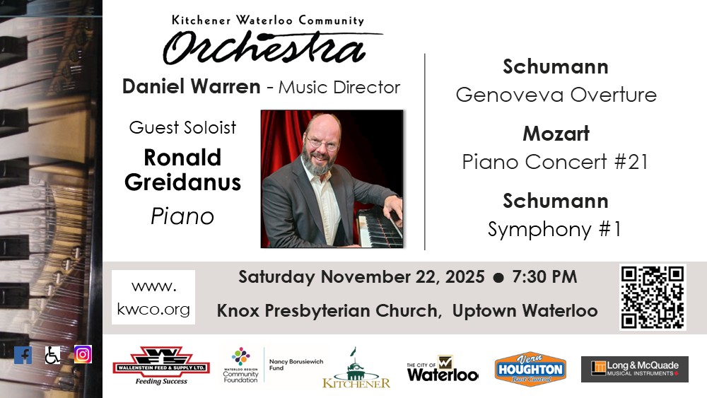 Join us Saturday, November 22, at 7:30 p.m. at Knox Presbyterian Church (50 Erb St. W., Waterloo) for a vibrant season opener featuring internationally acclaimed pianist and conductor Ron Greidanus. The evening’s program includes Schumann’s dramatic Genoveva Overture, Mozart’s lyrical Piano Concerto No. 21, and Schumann’s radiant Spring Symphony—a night of drama, elegance, and joyful renewal.